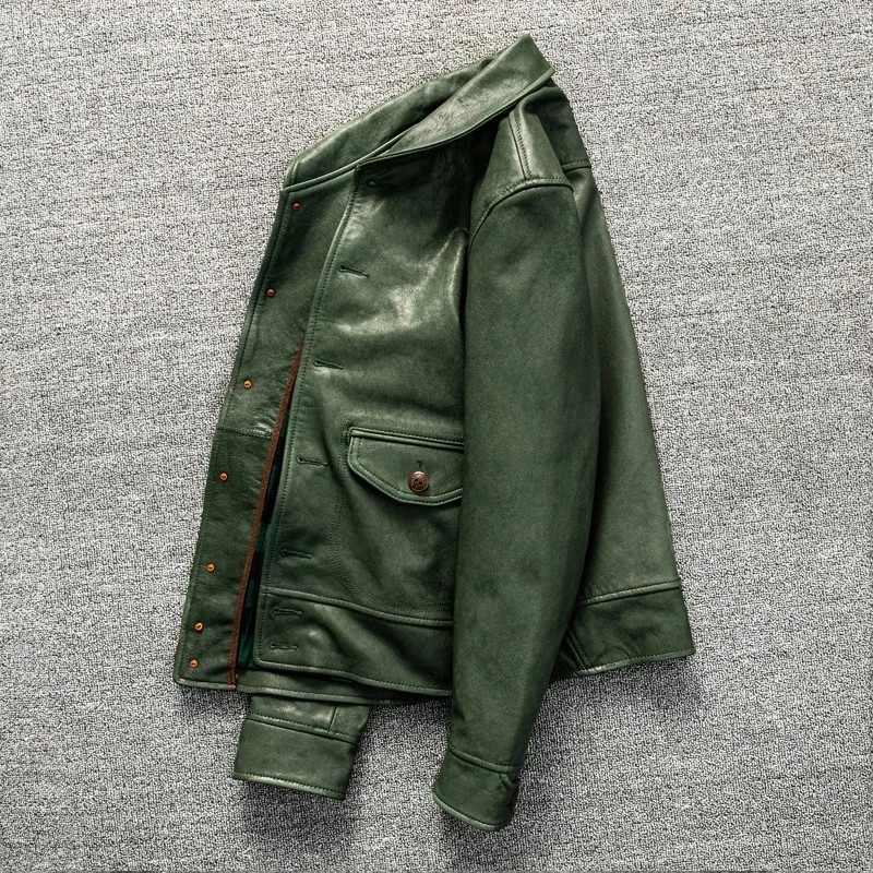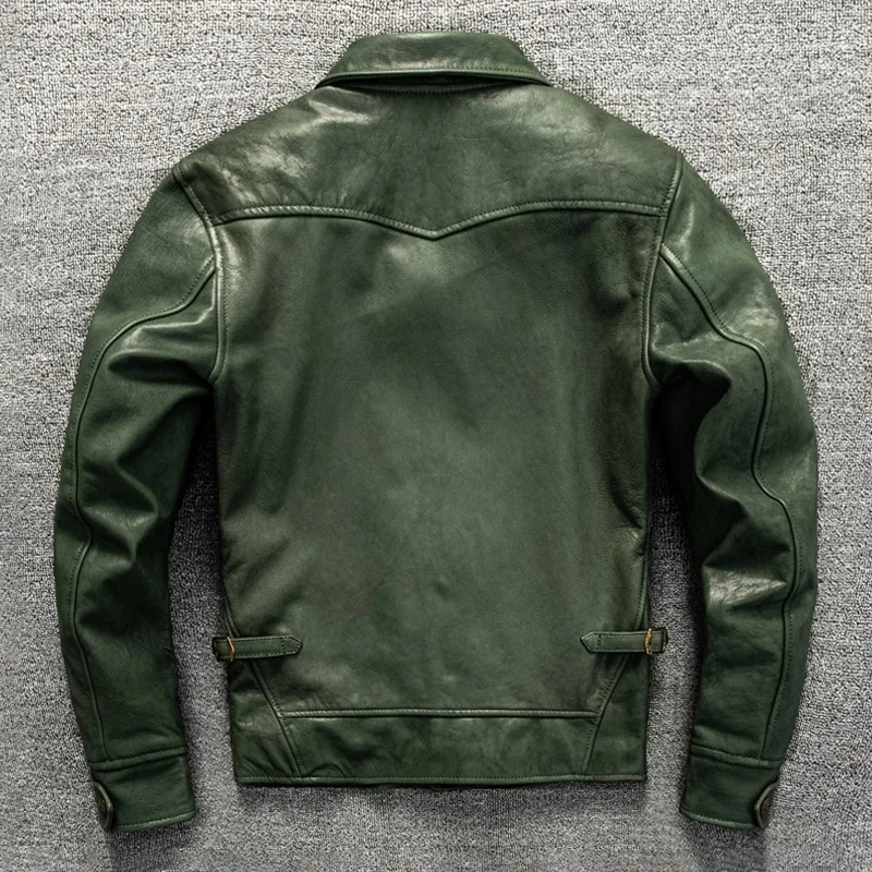 Step into bold sophistication with the Evergreen Vintage Leather Jacket, crafted from premium genuine leather and designed for men who demand both style and durability. This standout piece features a deep green finish, button-up closure, and a comfortable check-pattern lining—making it the perfect blend of rugged charm and modern elegance.