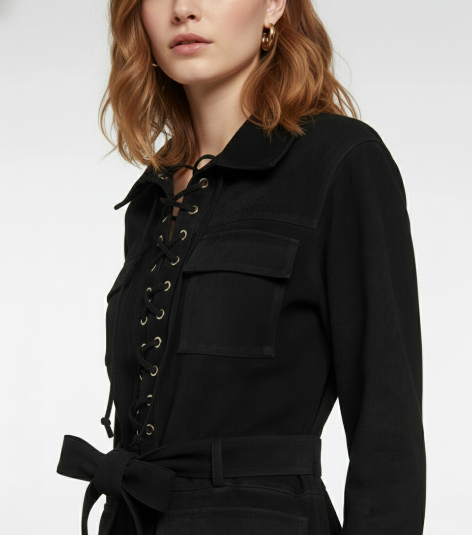 The dress boasts a sophisticated shirt collar and long sleeves, giving it a structured, polished silhouette. The defining feature is the bold front lace-up detail with gleaming gold-tone eyelets, allowing for adjustable styling and adding a dynamic texture contrast. Functional utility pockets sit neatly on the chest and hips, seamlessly merging style and practicality.