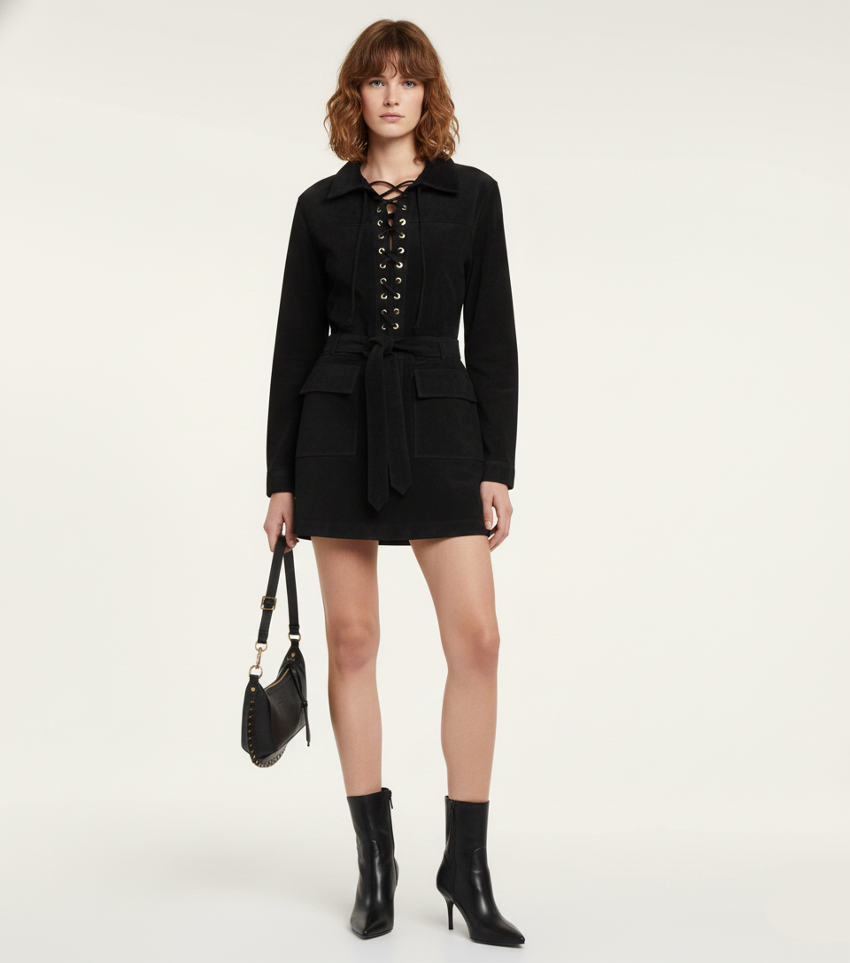 Be the first to review “Genuine Leather Lace-Up Utility Mini Dress”
