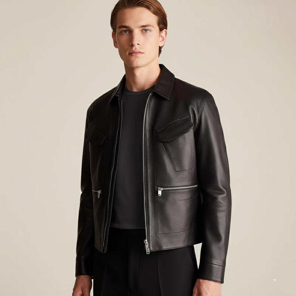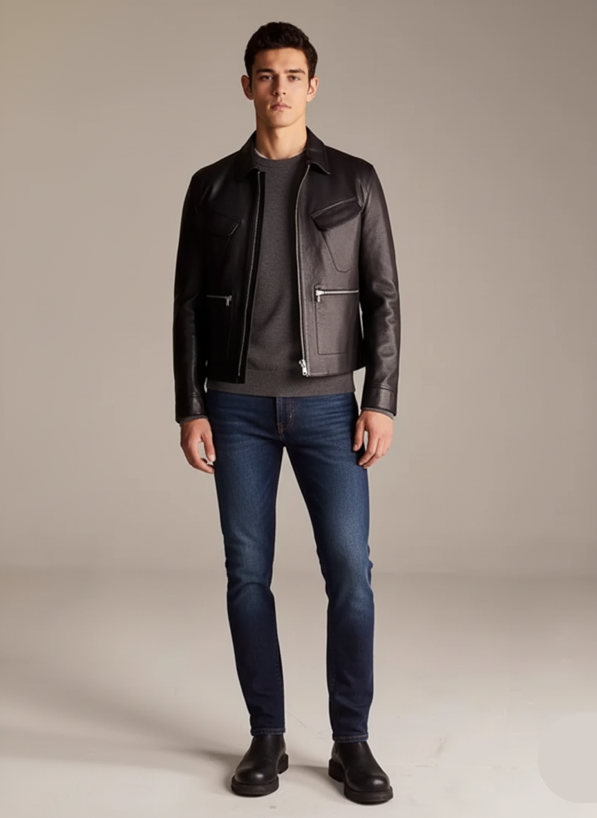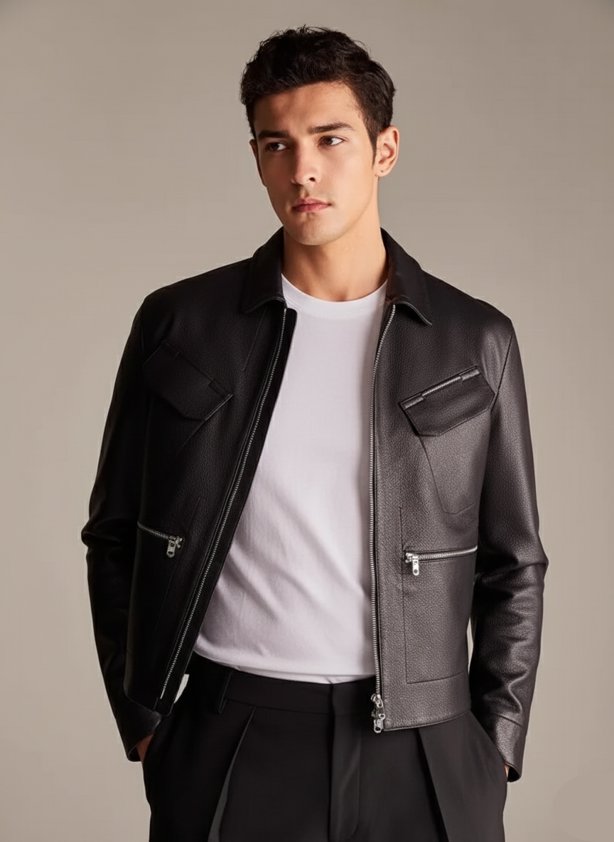 - Distinctive Zip-Pockets: The signature feature: four generously sized, sleek zippered patch pockets on the front. These are not only a bold aesthetic choice but offer secure, practical storage for your essentials—a true nod to utility leather jacket design.