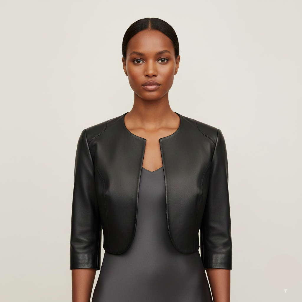 Elevate your ensemble with the timeless sophistication of The Lumina, a beautifully crafted Black Genuine Leather Cropped Bolero Shrug.