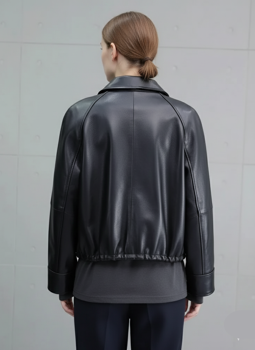 This exceptional piece blends the classic, masculine silhouette of a bomber jacket with contemporary women’s styling. It is a full-zip jacket featuring a refined classic collar and a fashion-forward, oversized fit that provides the perfect canvas for layering. The jacket is finished in a timeless Jet Black color, ensuring this piece remains a foundational element of your wardrobe for years to come.