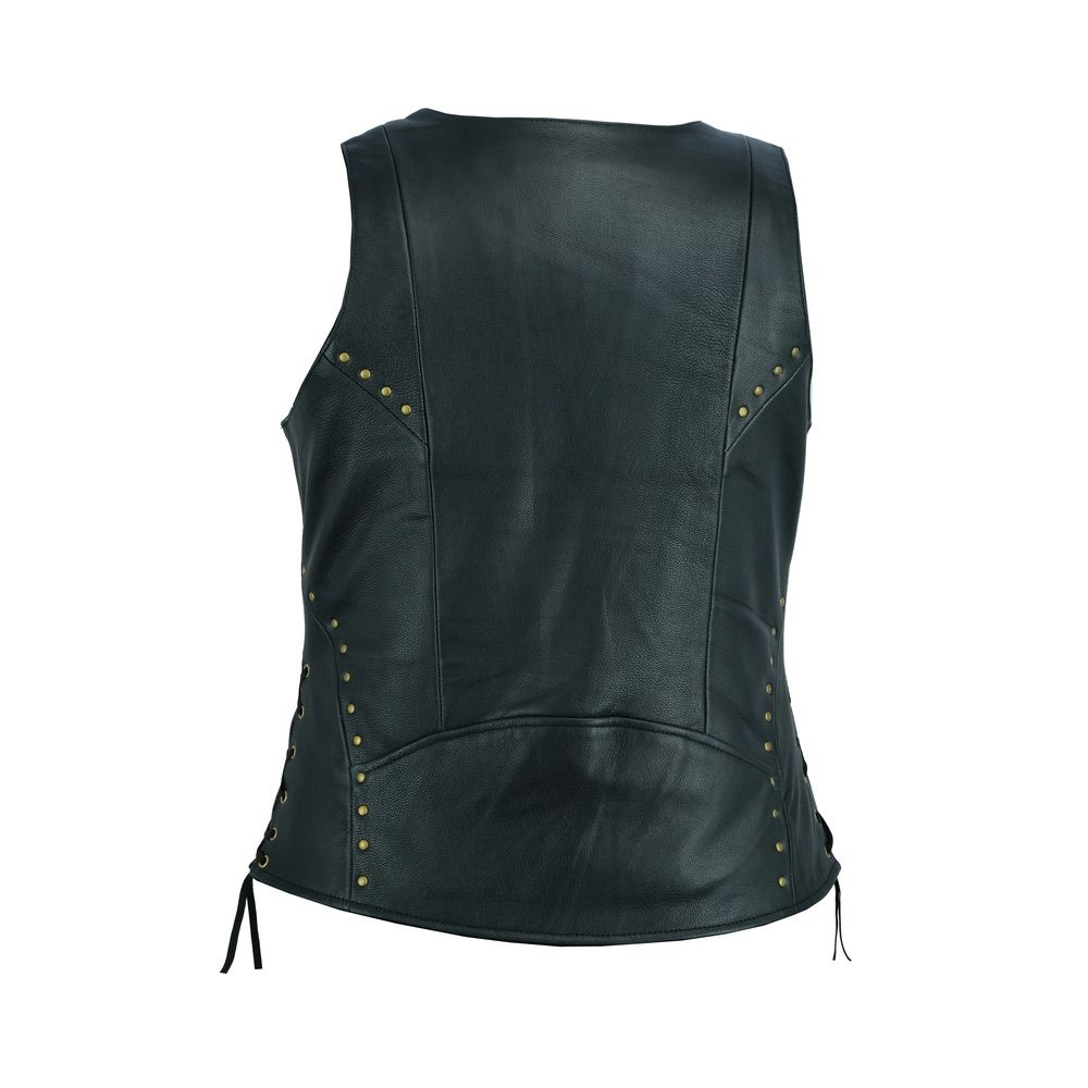 The ‘Rebel’ Vest is the ultimate combination of classic black leather vest appeal and high-impact design. The detailed lacing and prominent stud work create a cohesive, stunning 360-degree look, ensuring you stand out whether you’re riding or walking. This definitive women’s leather motorcycle vest is versatile enough to elevate any outfit.