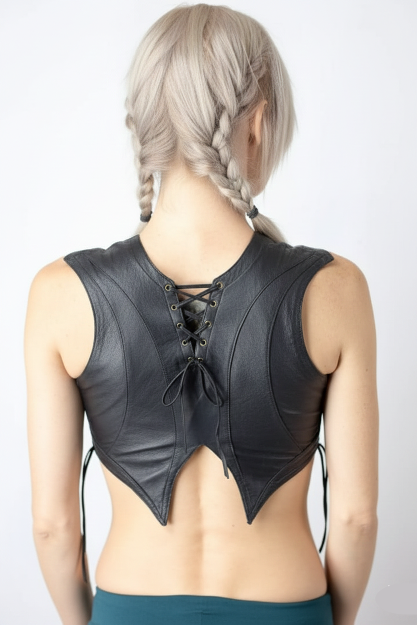 At Vanguard Thread, we pride ourselves on exceptional quality. This leather lace-up top is created by master artisans who handle the genuine hide with expert precision. The quality of our custom leather clothing speaks for itself—from the strong, consistent stitching to the durable metal eyelets used for the lacing. The rich, deep black color will be a stunning, versatile anchor for countless outfits.